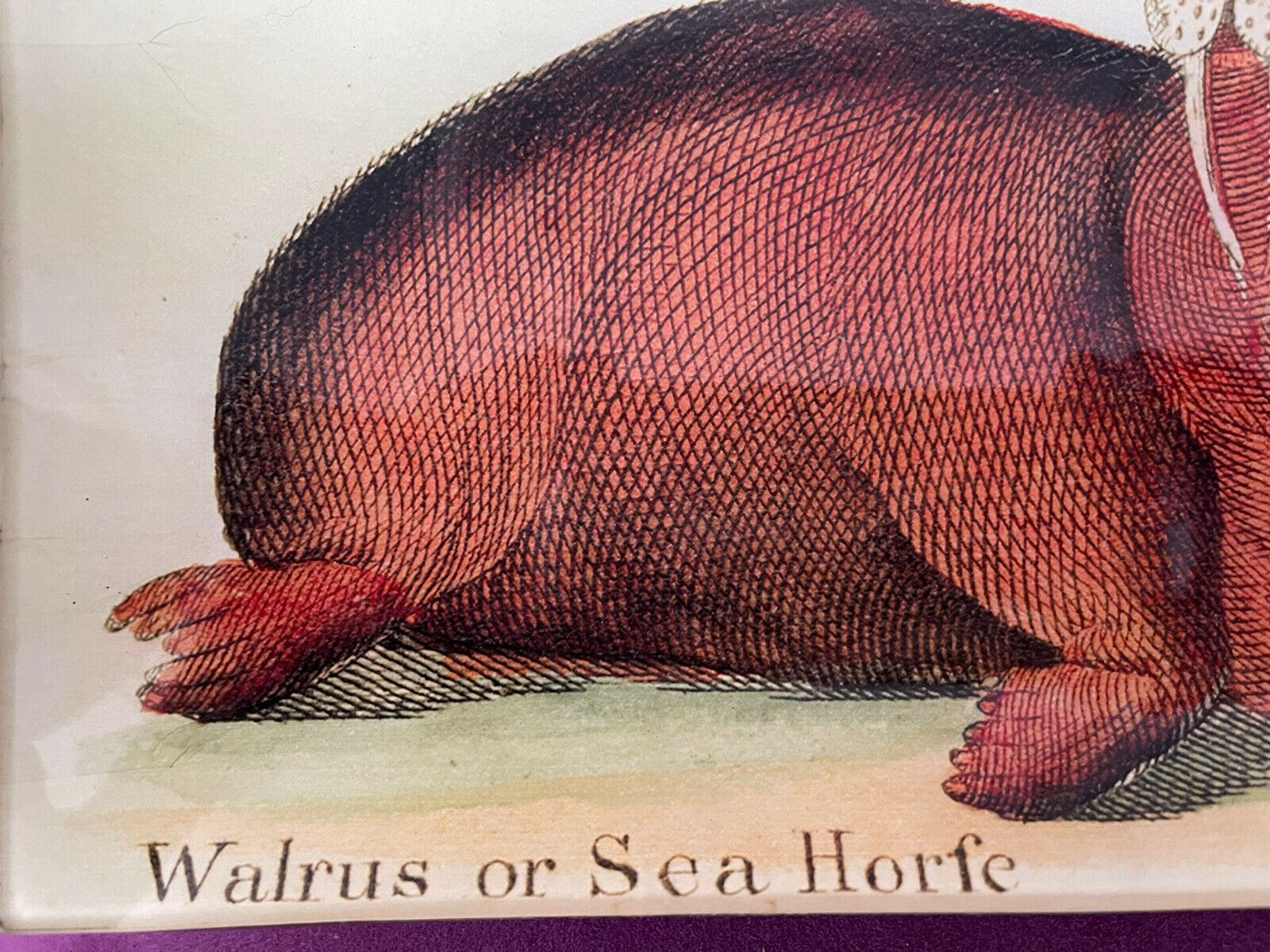 From the now defunct Kaas Glassworks on Perry Street in NYC’s West Village, this one of a kind Decoupaged Trinket Tray Dish features a vintage print of a Walrus or “Sea Horse”. Handmade and Signed by Carol Kaas, it measures 10” x 5”. Condition is excellent with no damage I can find. Please ask any and all questions prior to offer or purchase.