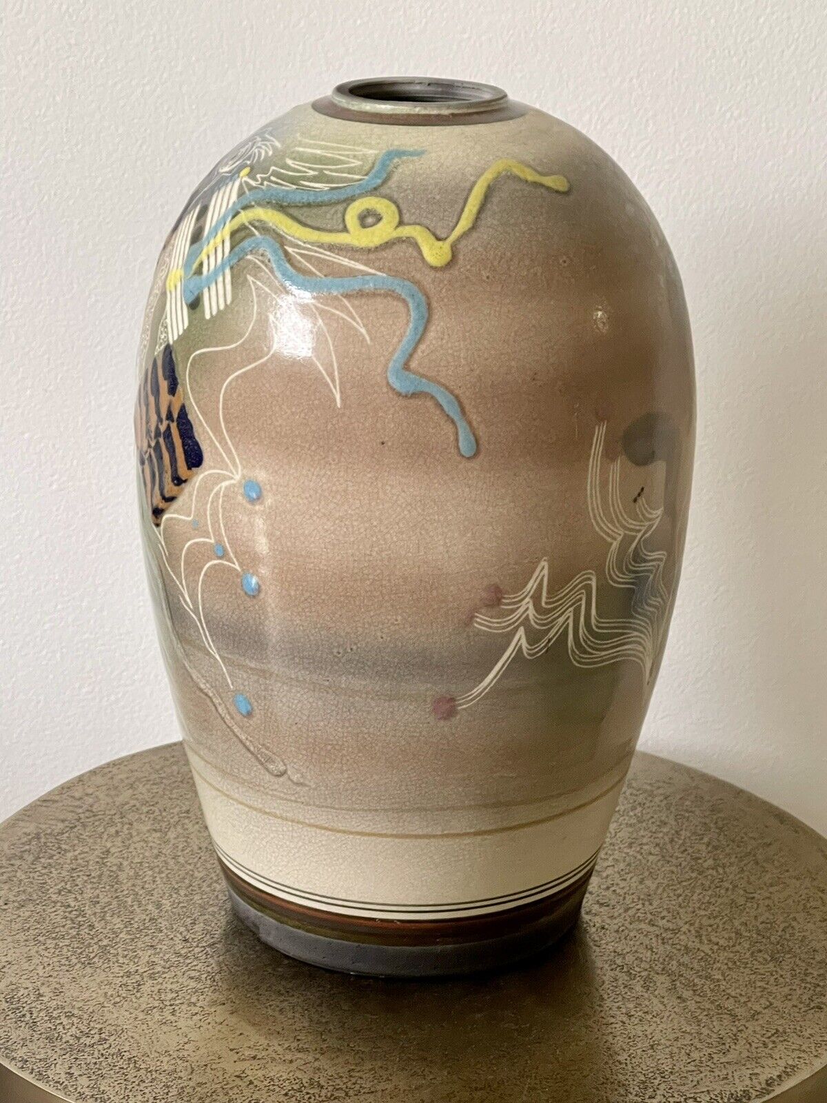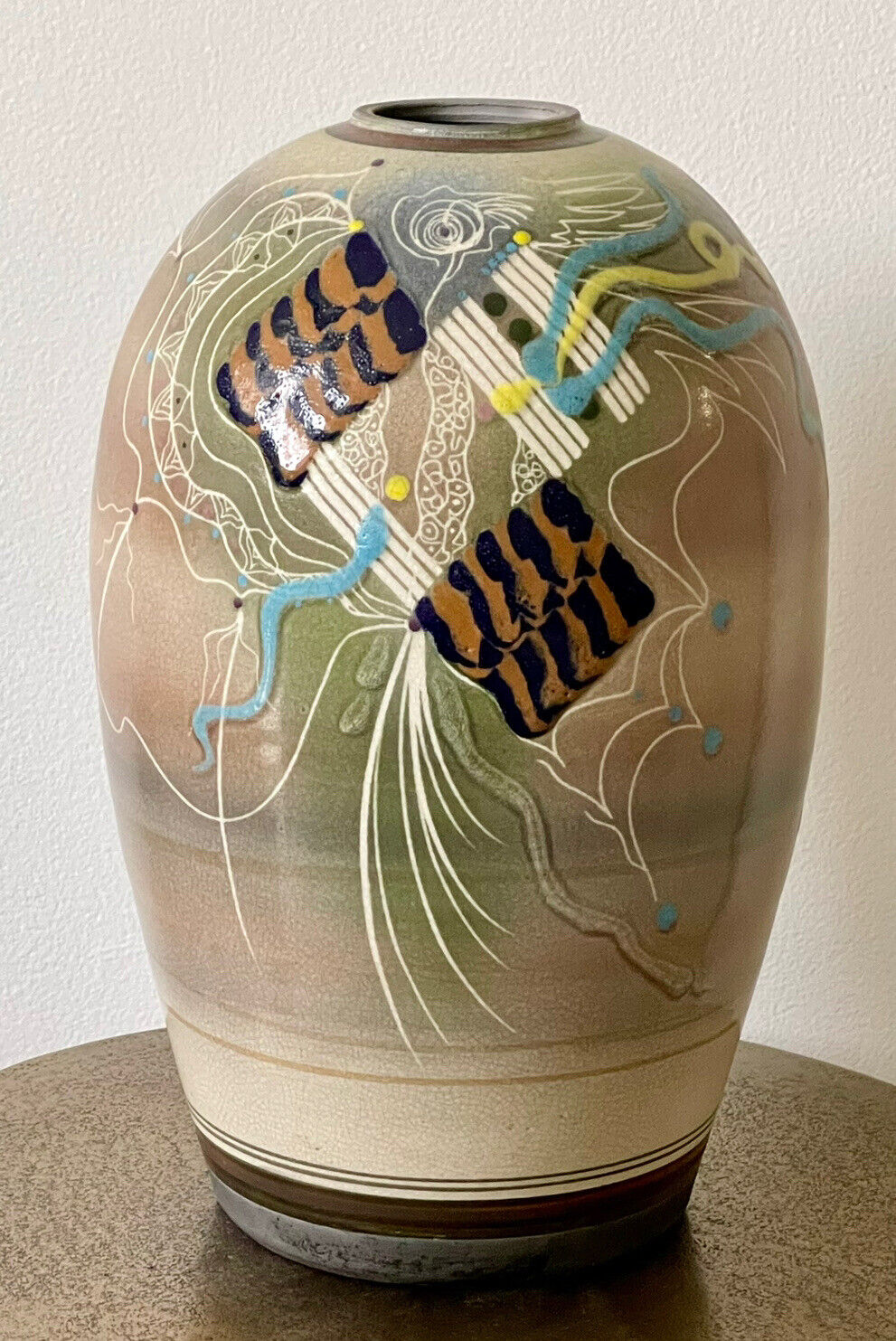 Monumental Jamie Davis Studio Art Pottery 1980s Postmodern Raku Ceramic Vase 14”