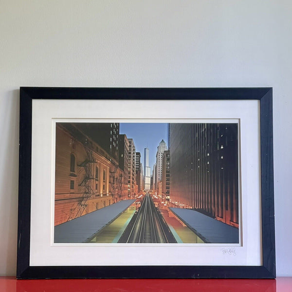 PALM BEACH ESTATE FIND!! Fabulous Large Scale original Fine Art color Photograph of an iconic Chicago Cityscape by Bob Gally. Measures 36.5” wide and 27.5” framed and matted. Matte signed. The frame is black wood and is in overall good+ condition with a few minor scuffs blemishes. The wire on the back needs to be replaced and then it will be ready to hang! We apologize for the high cost of shipping but all our carriers have raised their rates on heavy and oversized items, of which this is both. Please ask any and all questions prior to offer or purchase.