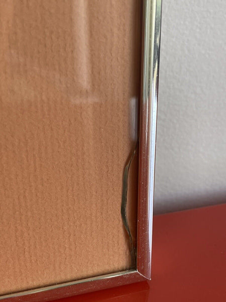 Overall framed measurements are 19” wide x 25” tall and the artwork image measures approximately 7.5” x 10” within. The frame is a typical retro silver metal gallery style frame of the period. There is a crack in the glass lower right corner (shown) but it displays well when hung on the wall and I will leave the decision to repair it up to you.
